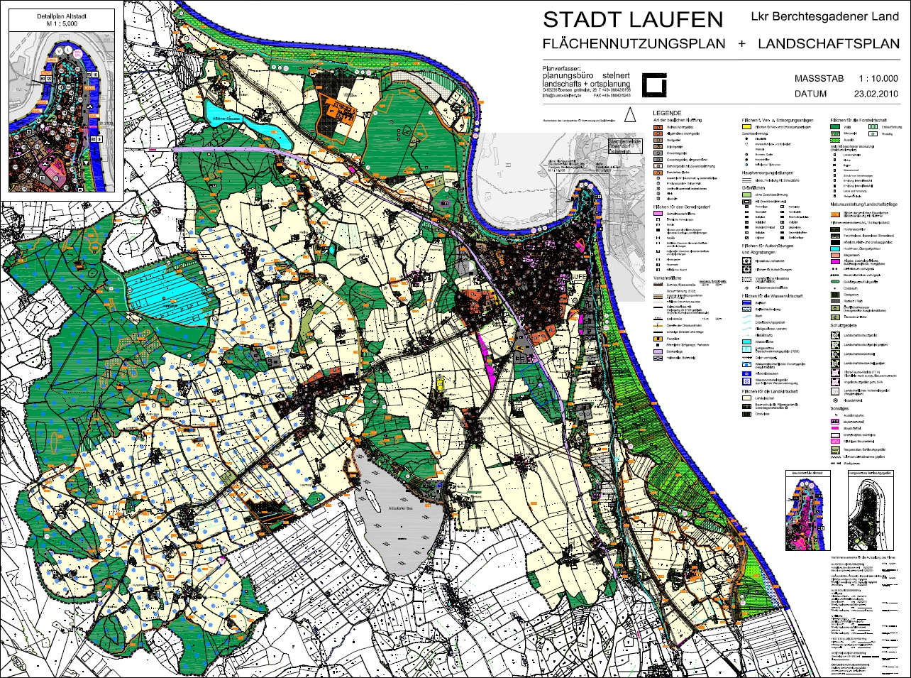 Seit 15.03.2011 ist der neu aufgestellte Flächennutzungsplan mit integriertem Landschaftsplan der Stadt Laufen rechtswirksam. Er spiegelt mit seinen Darstellungen und textlichen Aussagen die Planungsabsichten der Stadt für die nächsten 15-20 Jahre für das gesamte Gemeindegebiet der Stadt Laufen wider. Als sog. vorbereitender Bauleitplan gibt oder nimmt der Flächennutzungsplan jedoch kein unmittelbares Baurecht sondern stellt die Grundlage für die verbindliche Bauleitplanung (Bebauungspläne) sowie die Landschaftsplanung dar.