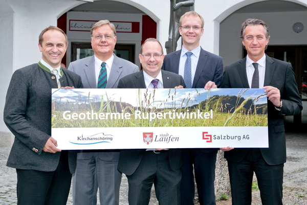Gruppenaufnahme - von links nach rechts: Erster Bürgermeister von Kirchanschöring Hans-Jörg Birner, Dipl.-Ing. Thomas Neu - proG.E.O., Erster Bürgermeister von Laufen Hans Feil, Dr. Henning Prüß - Salzburg AG, Dr. Leonhard Schitter - Salzburg AG